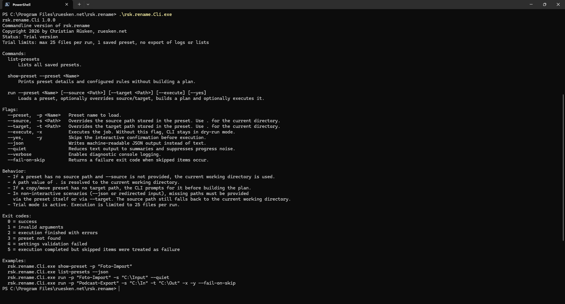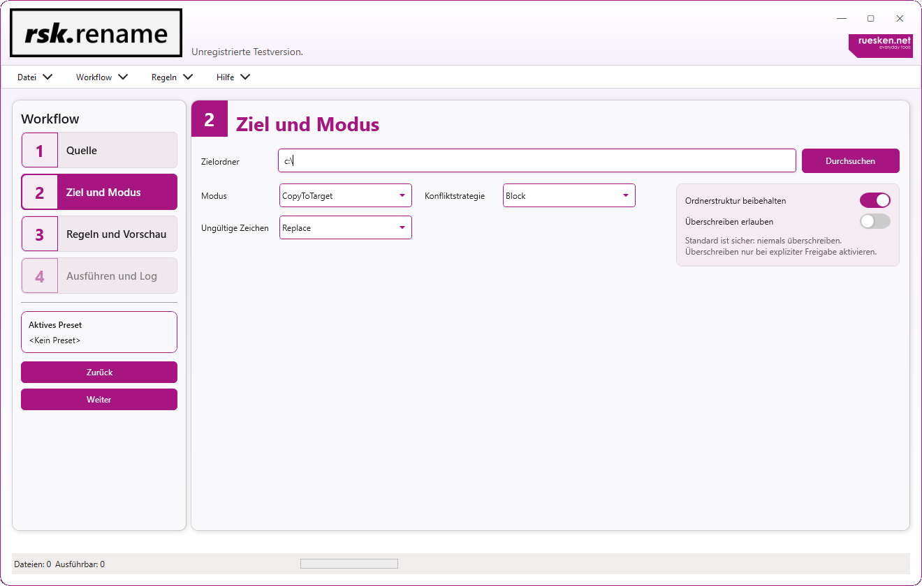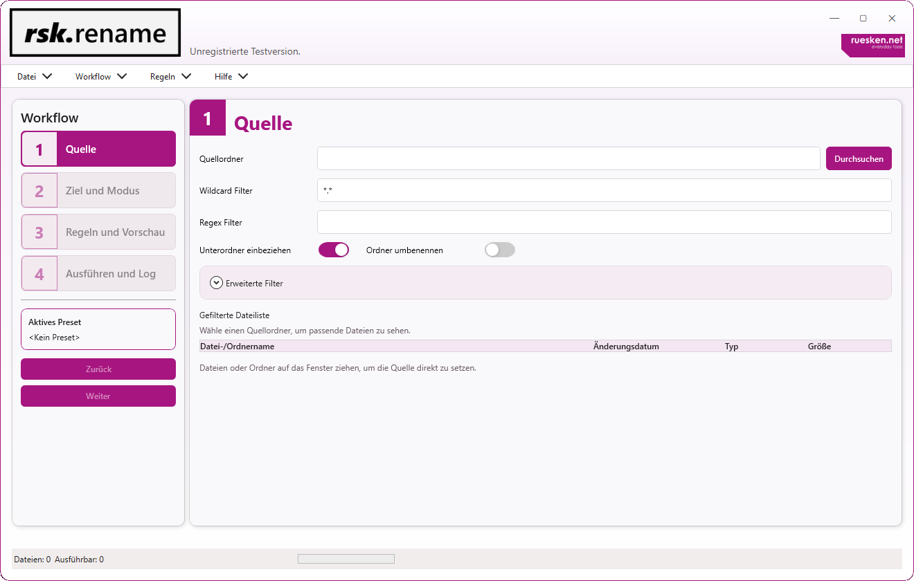 Hinweis zur Testversion: In der kostenlosen Testversion ist die Nutzung auf 25 Dateien pro Umbenennungsvorgang, ein gespeichertes Preset sowie ohne Export von Protokollen oder Listen begrenzt. So kannst du rsk.rename in Ruhe kennenlernen und den Workflow testen. Nach erfolgreicher Lizenzierung stehen alle Funktionen vollständig und ohne Einschränkungen zur Verfügung.