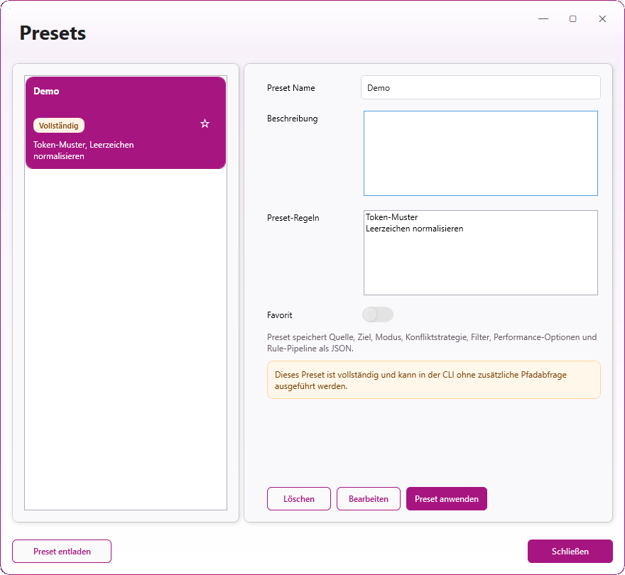 Gleichzeitig kannst du gespeicherte Presets auch per Commandline aufrufen. So lassen sich wiederkehrende Aufgaben in Batch-Dateien, Shell-Skripte oder technische Routinen integrieren. Du definierst die Logik komfortabel in der Oberfläche und nutzt sie später genau dort, wo Automatisierung sinnvoll ist.