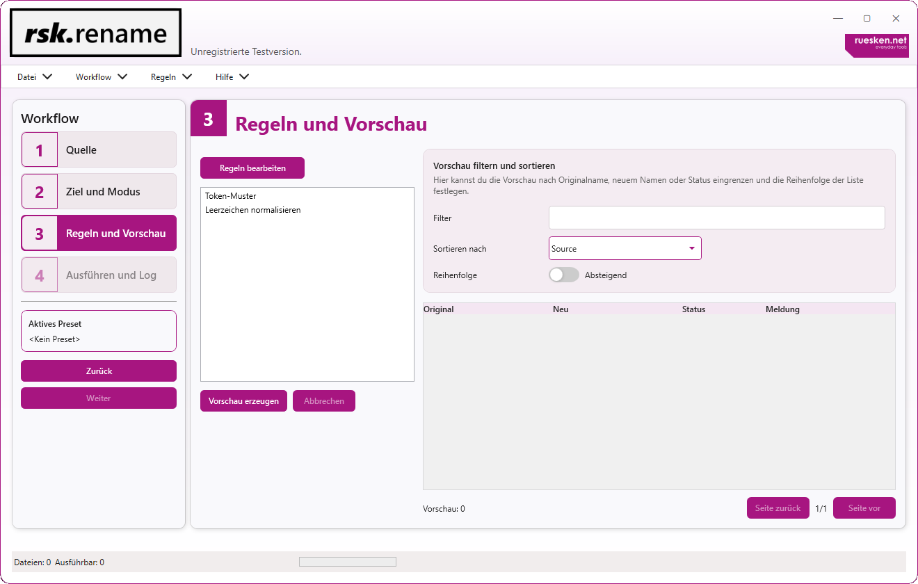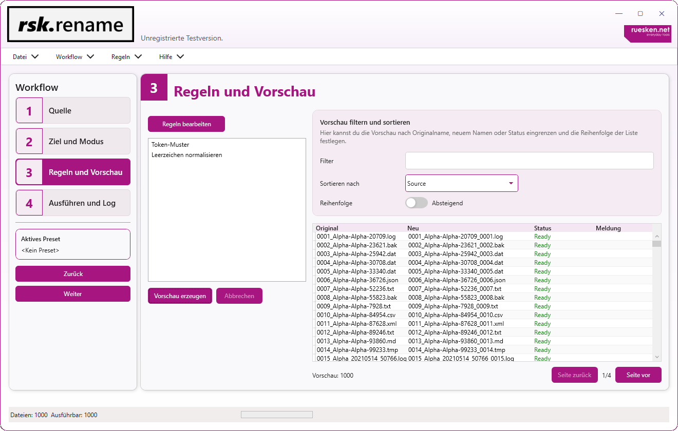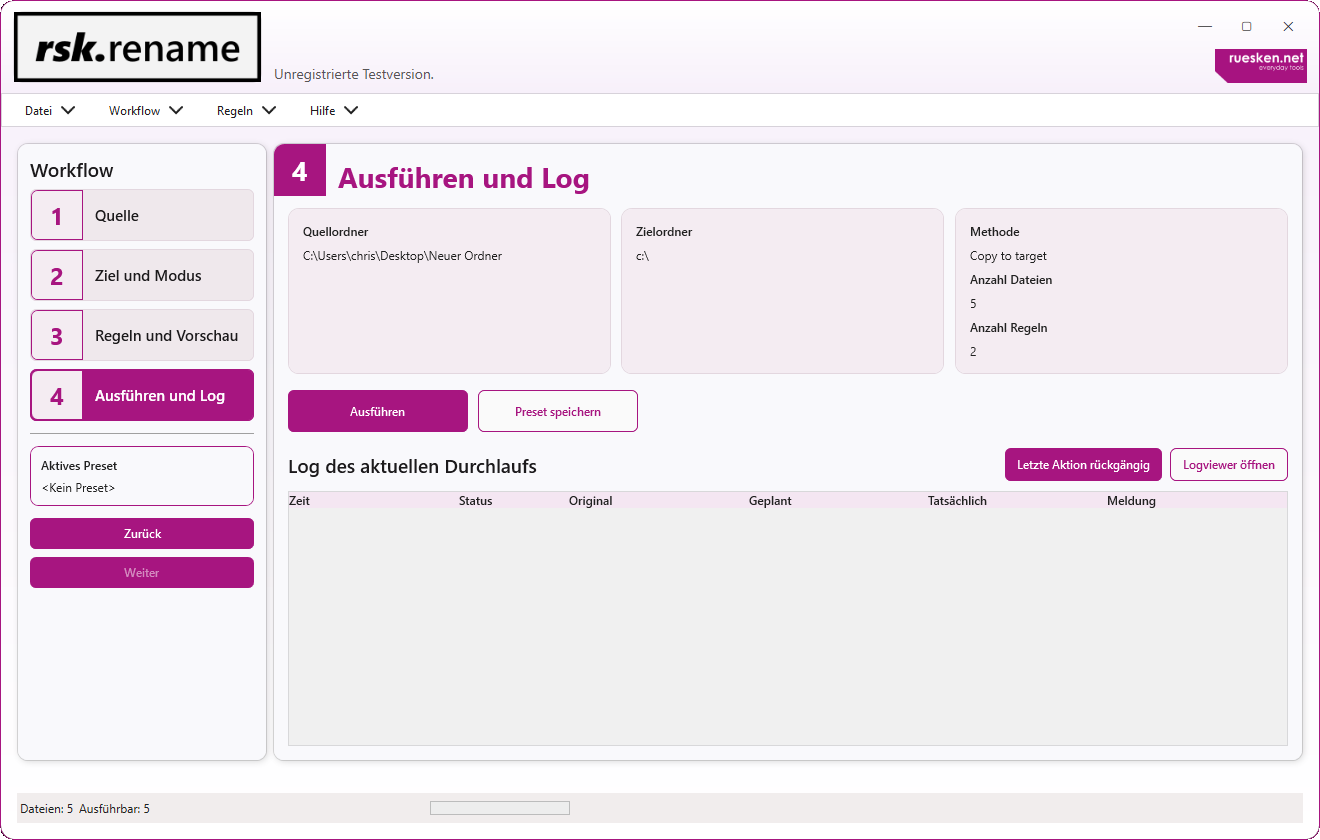 rsk.rename ist so aufgebaut, dass du mit der grafischen Oberfläche schnell produktiv arbeiten kannst. Der 4-Schritt-Workflow führt dich von der Quellauswahl über Regeln und Vorschau bis zur Ausführung mit Log und Undo. Das macht selbst größere Jobs nachvollziehbar und kontrollierbar.